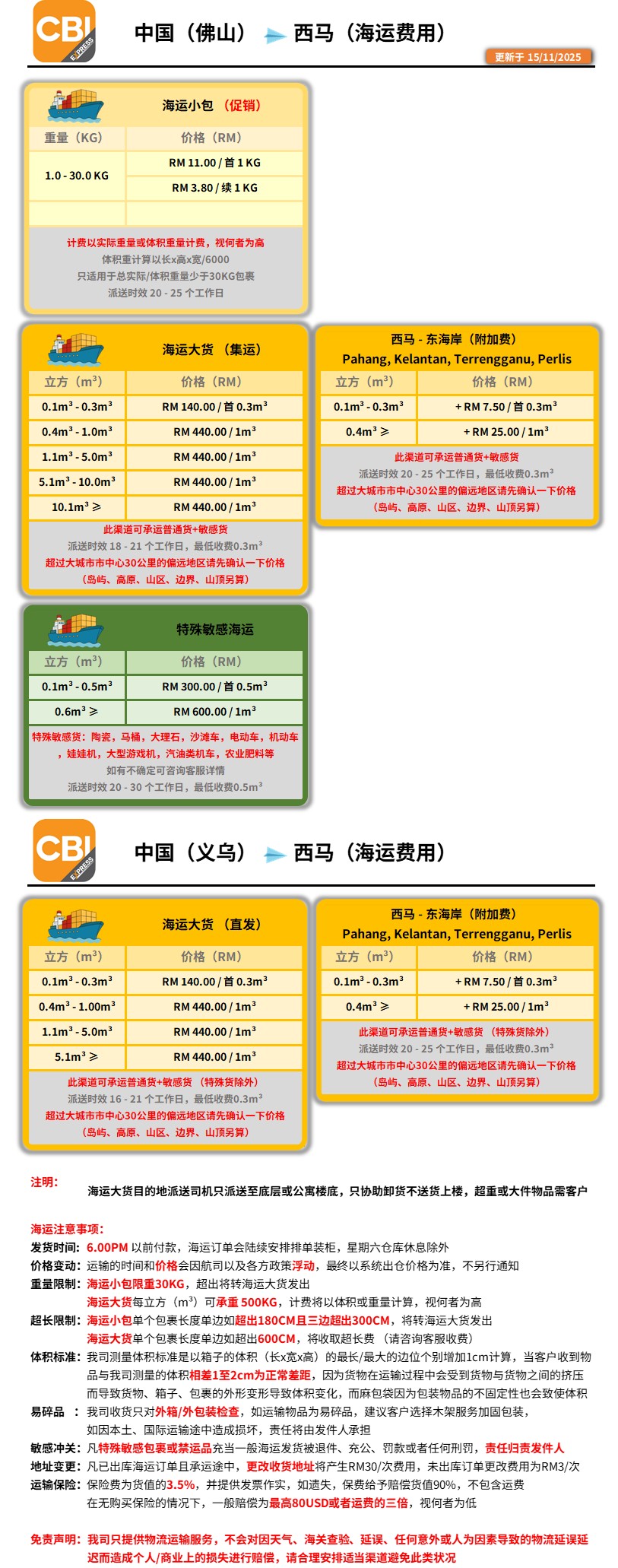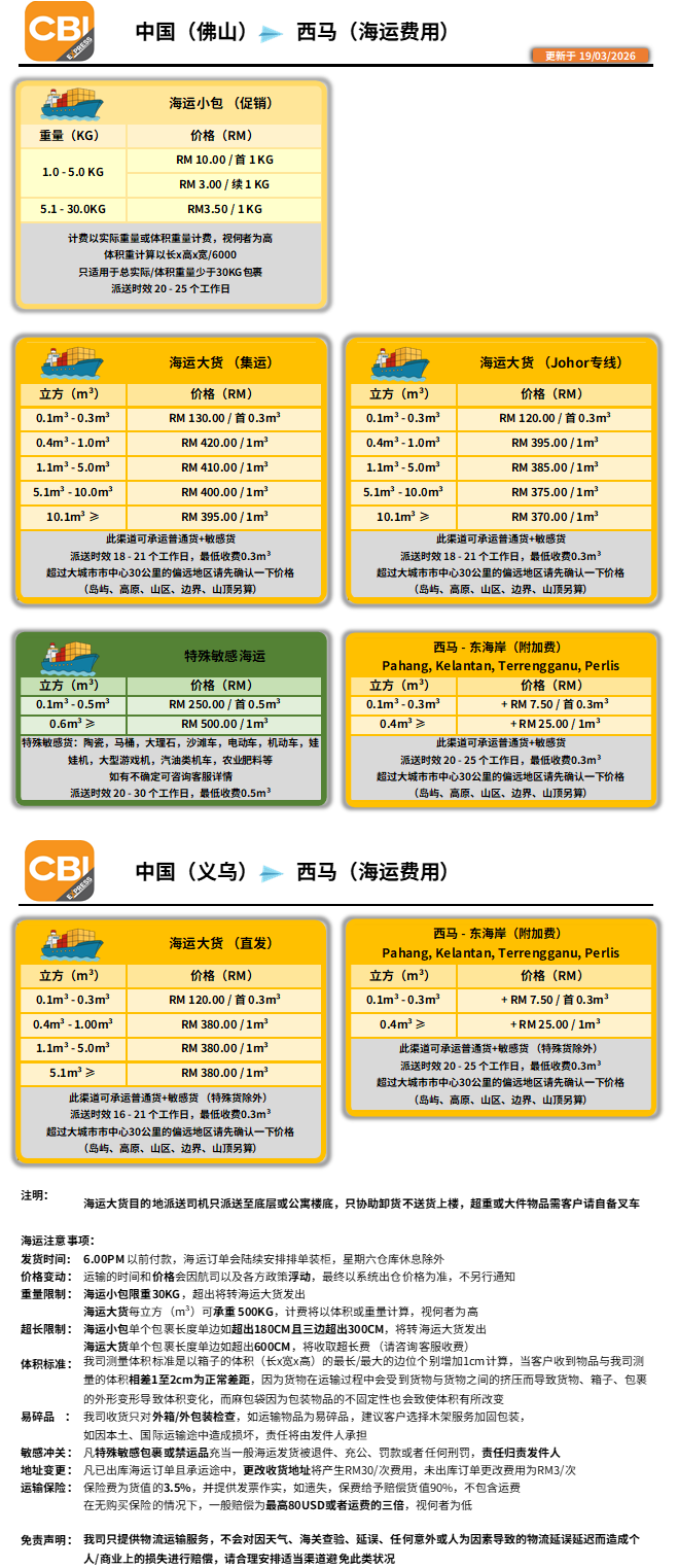 中国 - 西马来西亚(海运)价格表