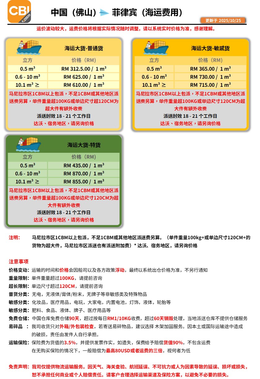 中国 - 菲律宾(海运)价格表